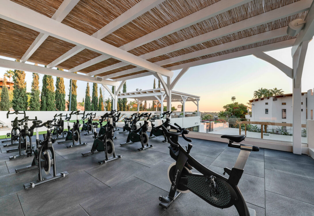 The fitness studio includes treadmills, a stair climber, an epi trainer, a weight and a squat rack, plus Concept 2 rowing machines. Upstairs, we have a dedicated outdoor spinning area to host your private classes, which can be arranged by our concierge.