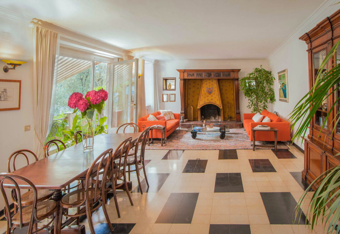 Gorgeous living room with dining table, antique fireplace, and large glass doors that light up the room naturally and open onto the panoramic terrace.