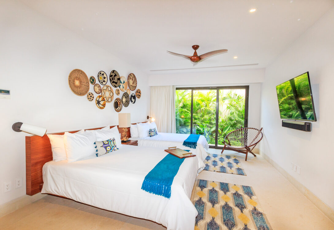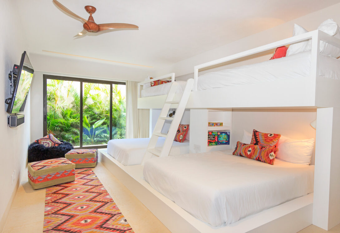 2 Queen size beds and bunk beds, TV, Sofa, Desk, Ensuite bathroom (shower), Walk-in closet, Safe, Terrace, Ocean view, A/C.