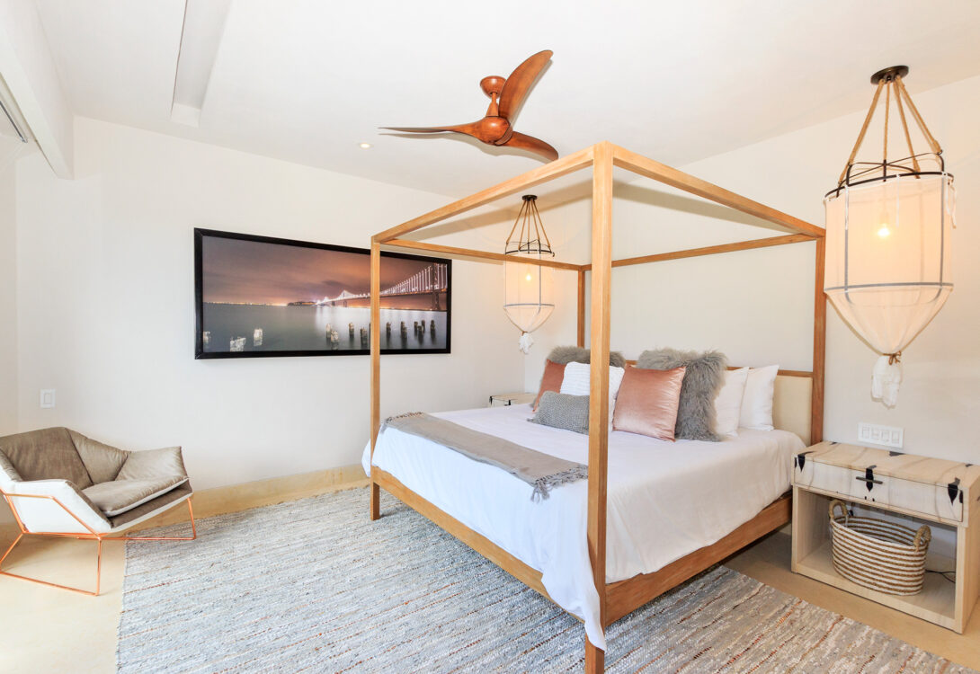 There are four bedrooms in the main house all have en-suite bathrooms. The main house has two king bedrooms and one with two queen beds, while the last bedroom has two queen beds plus a set of bunk beds. The combination of warm wood and soft-toned bedding and upholstery gives each of the suites a modern yet welcoming feel.