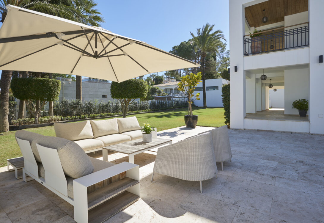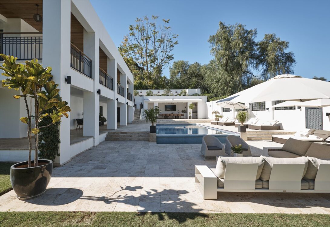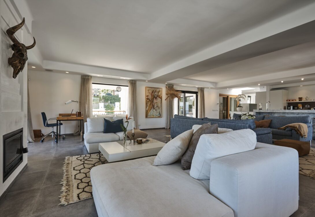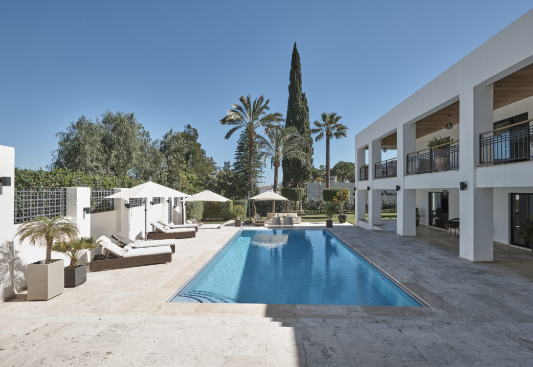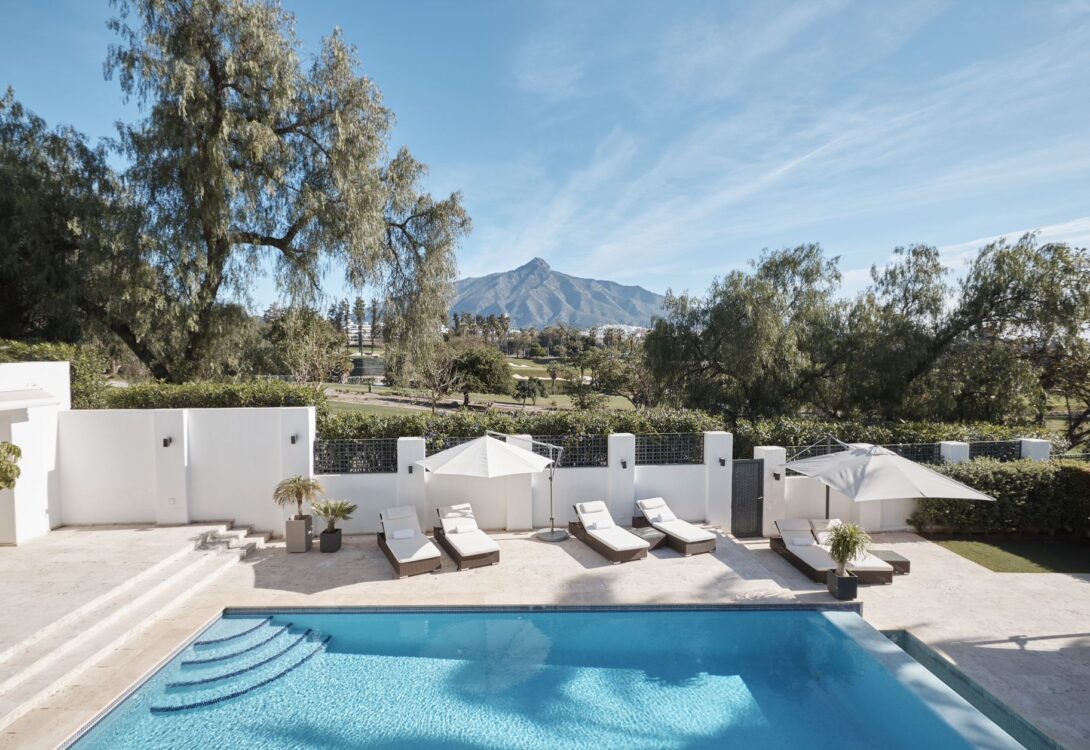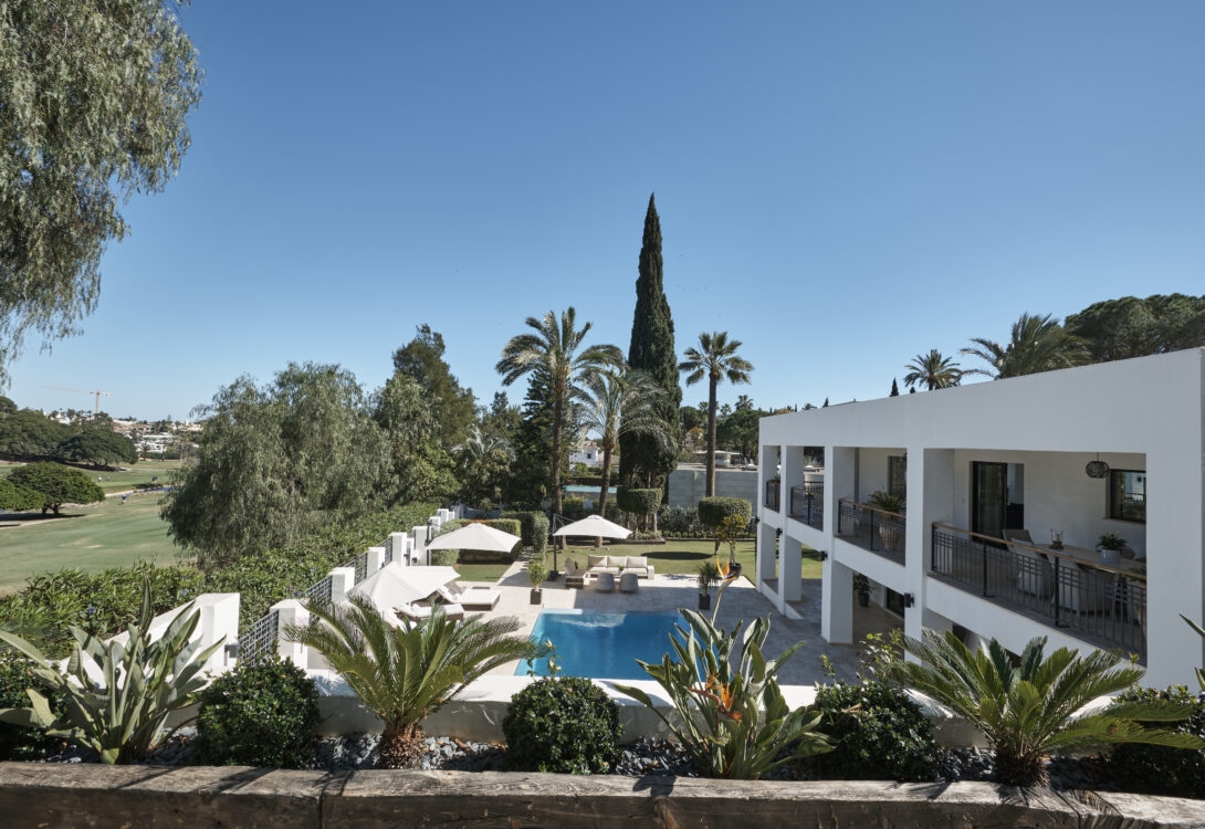 Thoughtful architecture and lush landscaping create a welcome degree of space, privacy and light. The villa is well distributed with a generous size and fully fitted open plan kitchen, an equally impressive lounge with various seating areas and a cozy dining room, all connected by an idyllic wrap-around terrace overlooking the pool, gardens and golf course.