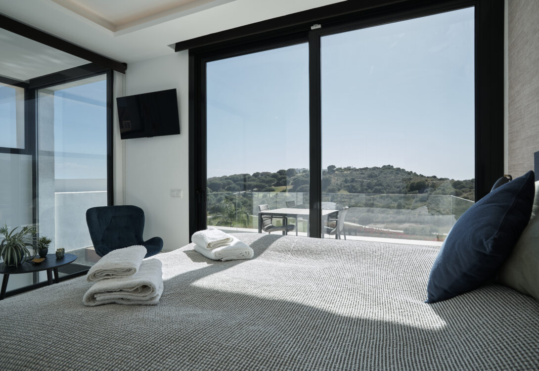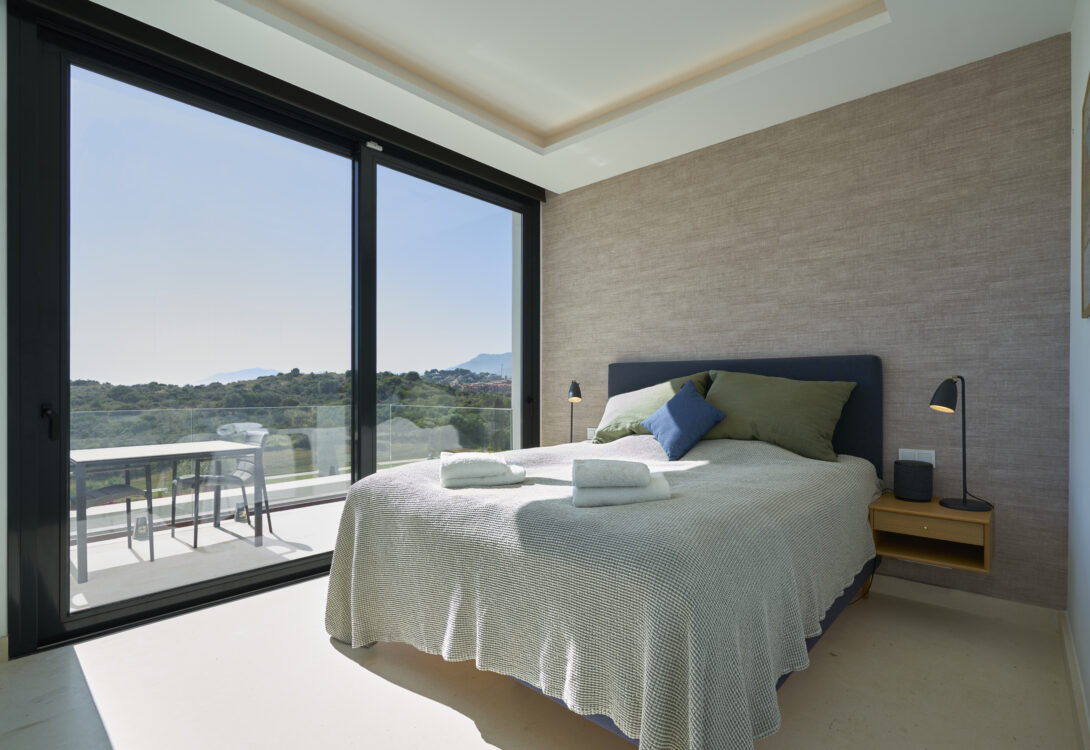 The upper floor of the villa has the master bedroom suite with its very own bathroom and a terrace that overlooks the garden. Views are to the pool, with views of the golf course, the Mediterranean Ocean and sunsets to make your holiday in Spain unforgettable.