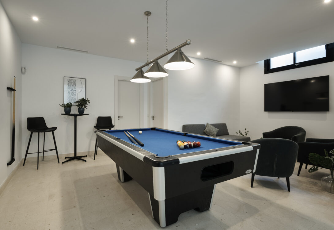 On the Lower floor of the mansion, one will find bedroom #4 with its bathroom. The TV area is also on the lower floor. A billiards table is Located in this entertainment area. This area is ideal for the children to enjoy time on their own if preferred.