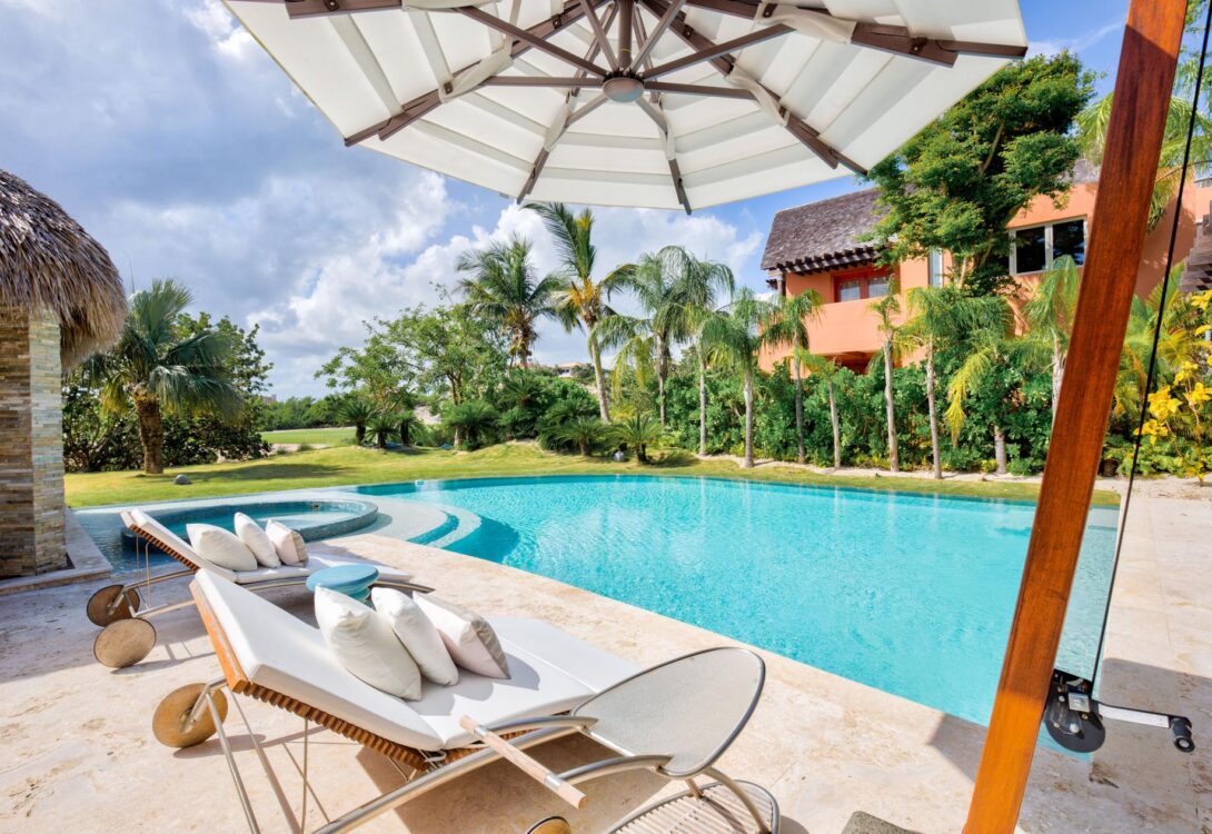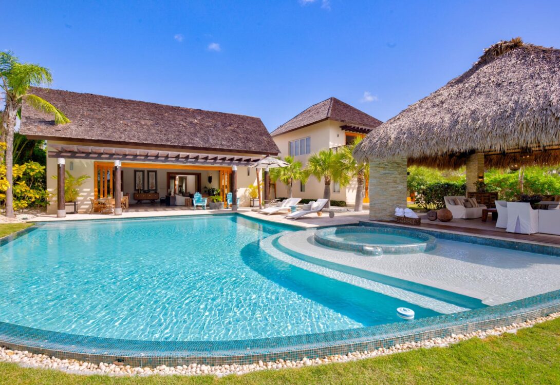 This magnificent villa is nestled in the prestigious gated Cap Cana community in the Dominican Republic. Situated nearby the Caribbean sea immersed in beautiful tropical surroundings. Relax or dine al fresco under the thatched palapa as the sun sets or sink into the hot tub with a glass of champagne.