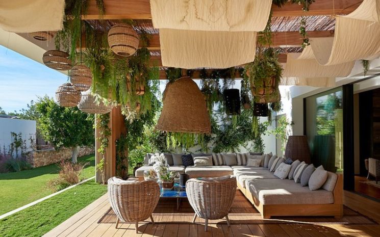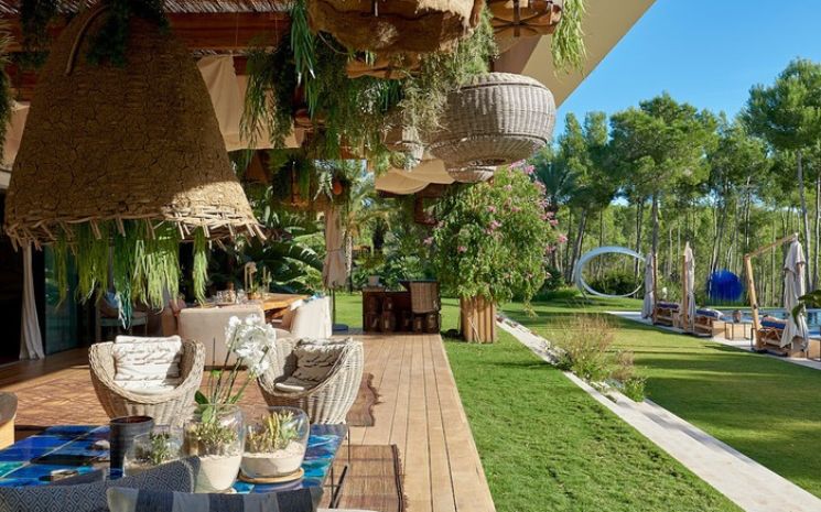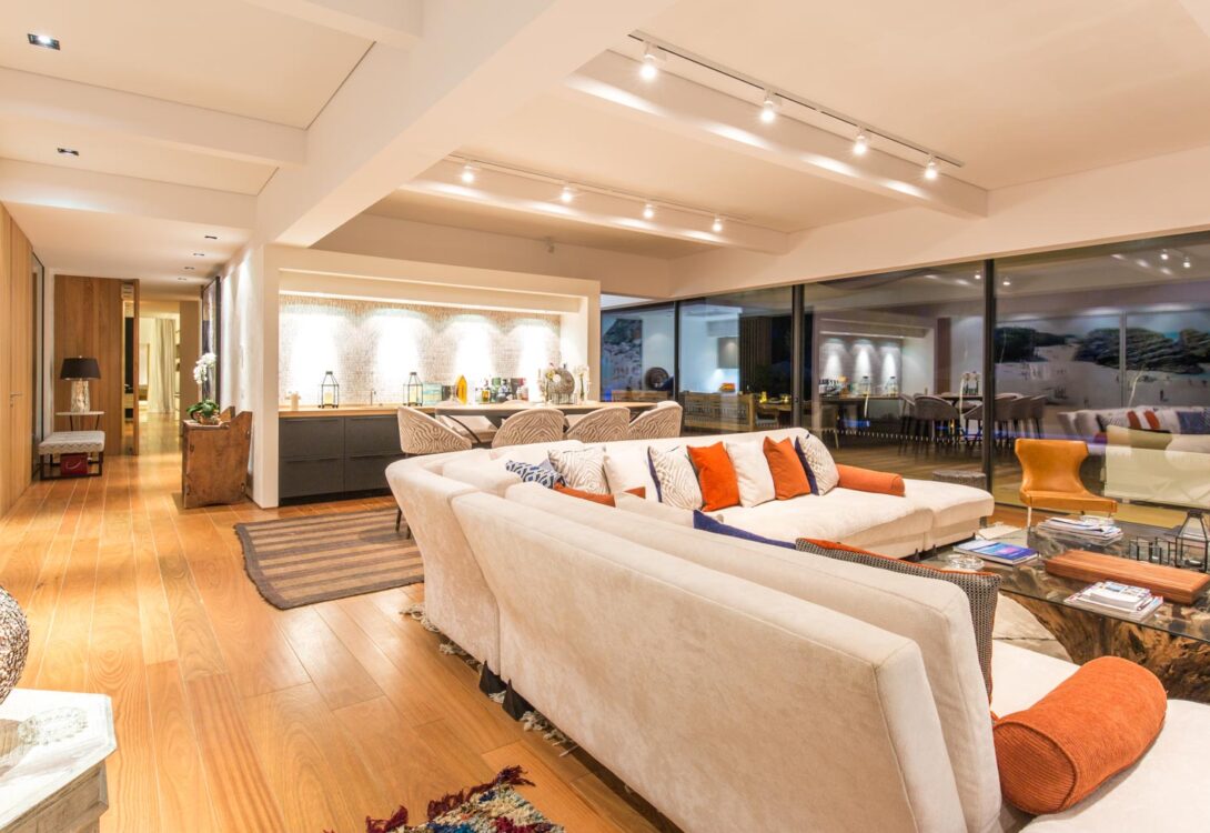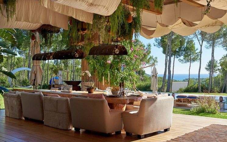There is plenty of outdoor space for relaxing, sitting and dining. The terrace features wide, corner seating and an extended dining table with views over the pool. There is a small “beach” area with sand, a bar and seating for 30 guests.