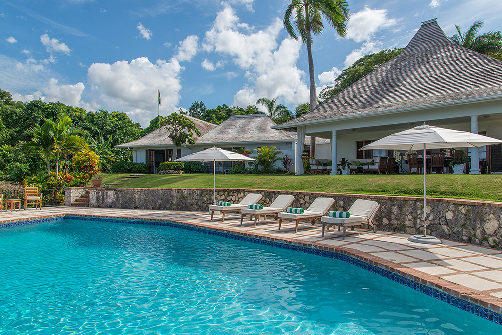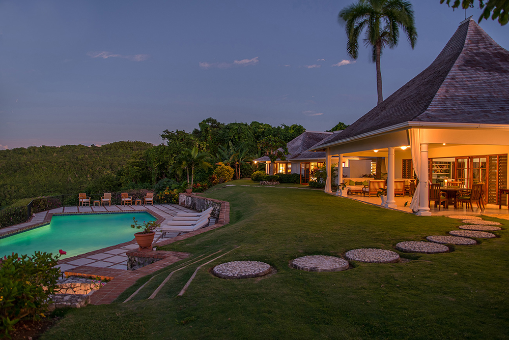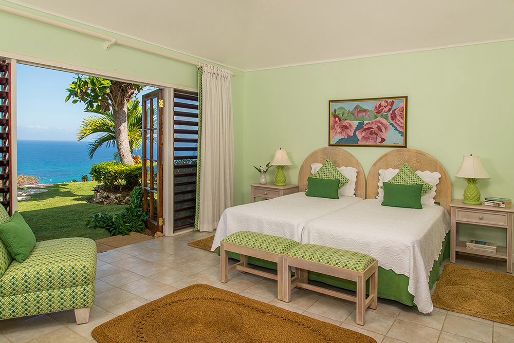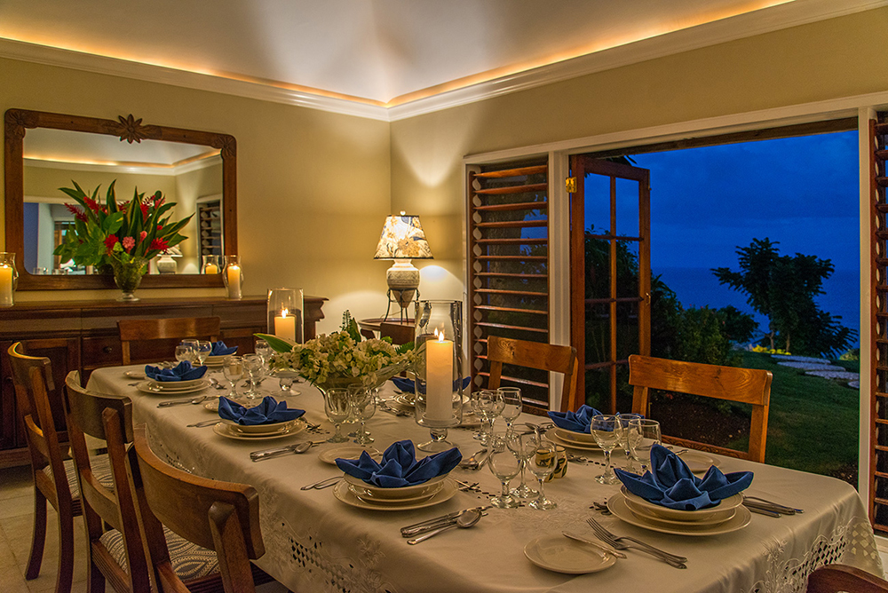 Cielo is built in a classical Caribbean style and on one level with a separate master’s cottage slightly below the main house. It has been cleverly designed to maximize both the hillside location and the panoramic ocean views. A wide sitting room anchors the house and flows out onto a deep veranda with a swimming pool beyond set into the lawn. To the left is a separate formal dining room and adjacent is a small office. The style throughout is at one with the natural environment, deep white slipcovered sofas and armchairs, vibrant Jamaican paintings, and accents of blue and pistachio green here and there. This is a home with all the attributes for living in the tropics.