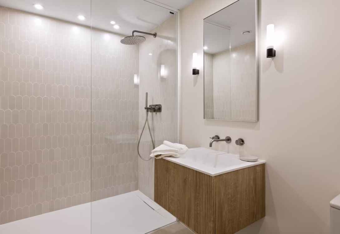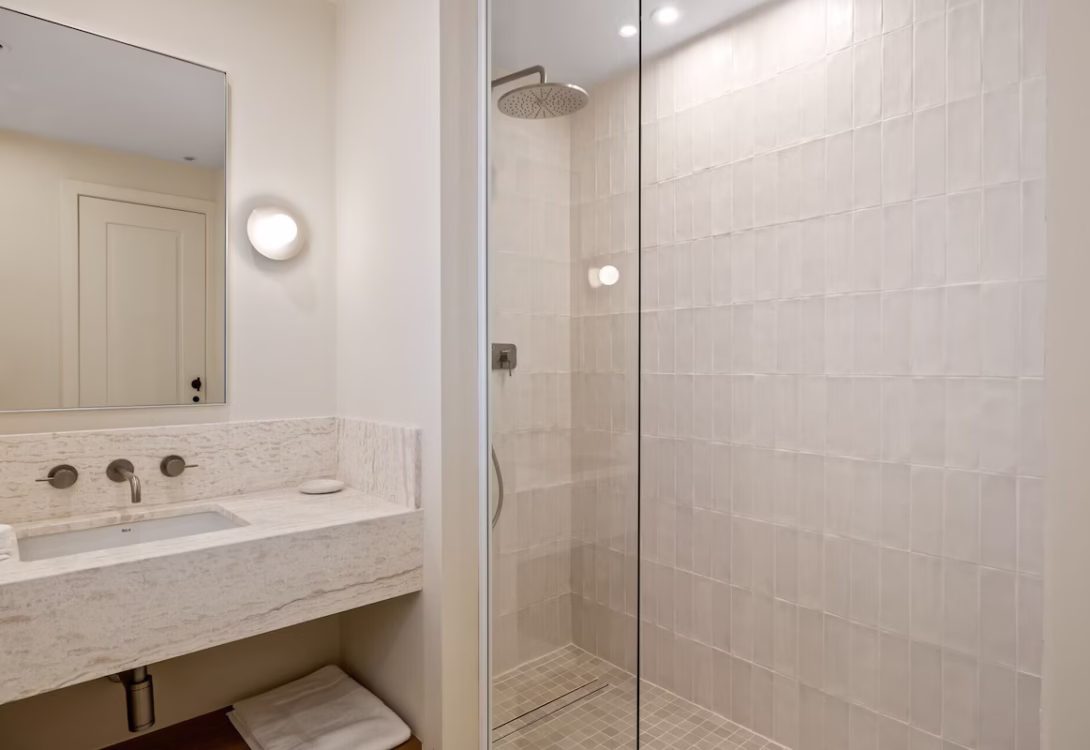 On your right-hand side from the entrance sits the third bedroom, it holds two large single beds which are placed together to form a large double but can be separated into two single beds on request. This room also has an ensuite bathroom with a rain shower.