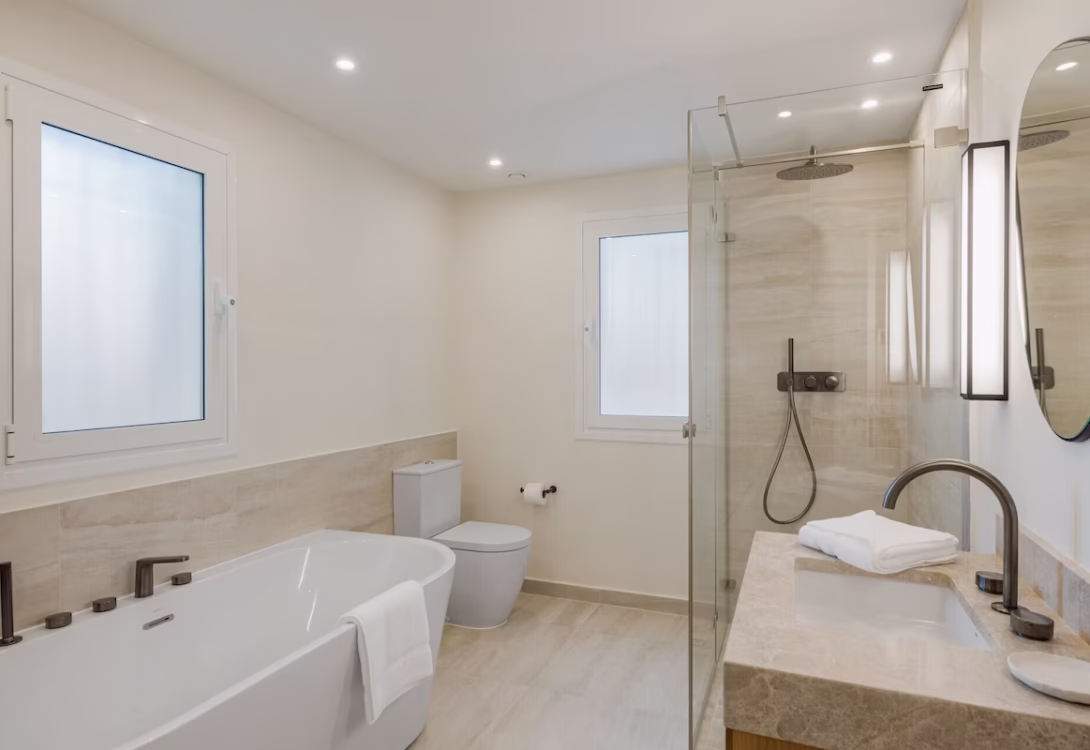 Entering through the front door, to your left-hand side you will have access to a guest wc as well as a double bedroom with an ensuite bathroom. At the end of the hall, you will enter the master bedroom with an ensuite bathroom featuring a rain shower as well as a bathtub. Both rooms have direct access to the terrace and pool area with glass sliding doors.