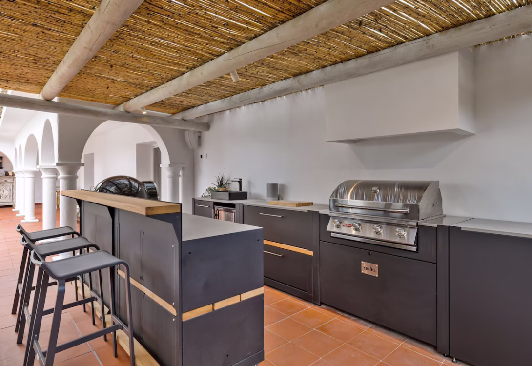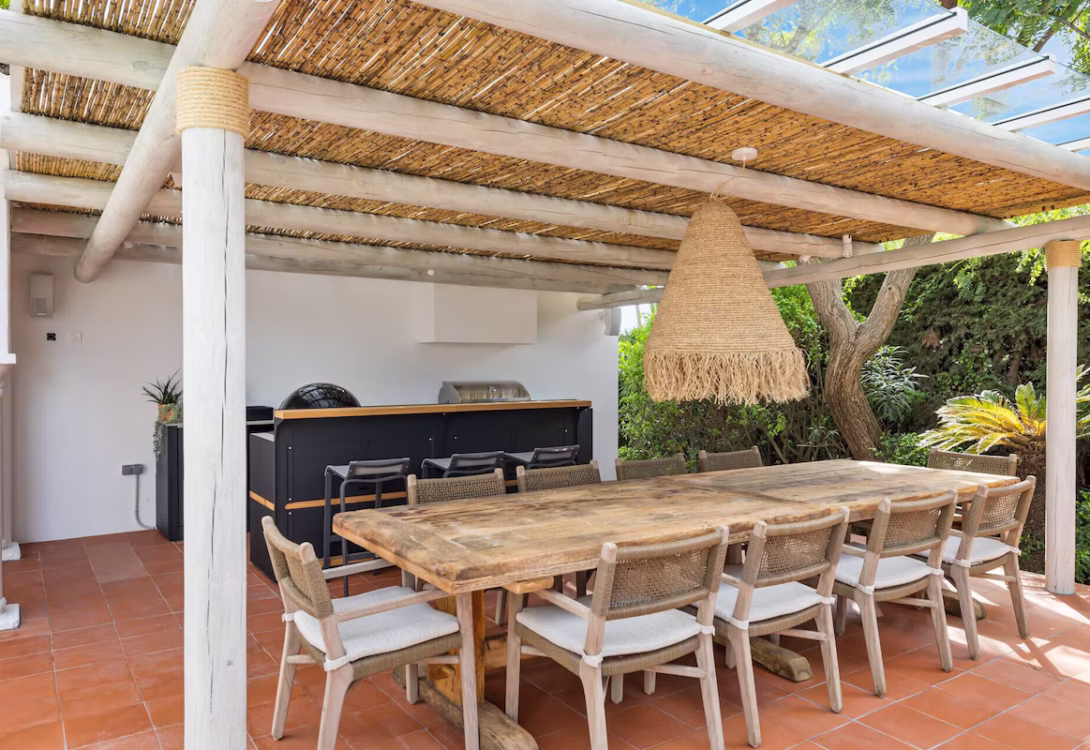 Headed out onto the terrace you are immediately welcomed by the greenery that surrounds the home. A pleasantly calm outdoor lounge area with sofas and surrounding seats, as well as a full outdoor dining area that seats 10, make this a wonderful spot to chill out and soak in the rays, entertain the group, or simply read your favourite book. The outdoor kitchen has a gas ignited BBQ, pizza oven and a fridge.