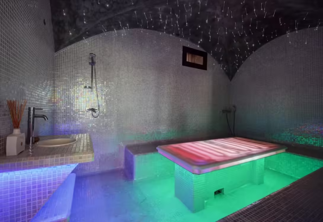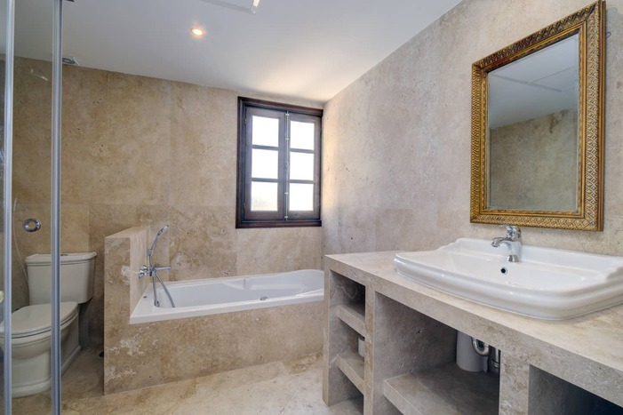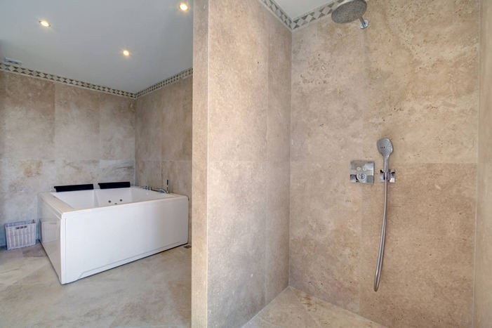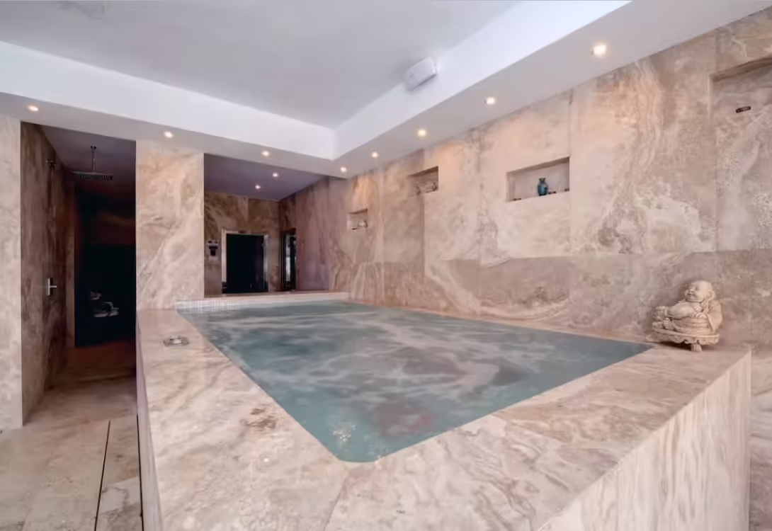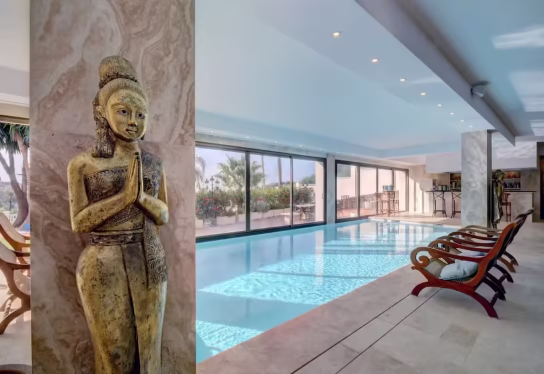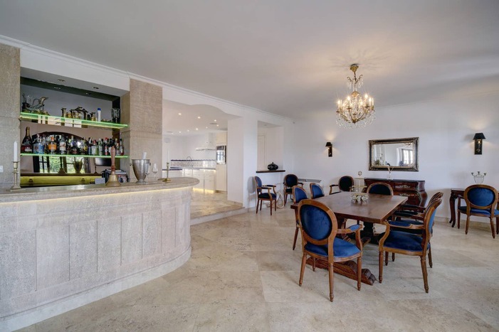 The nine bedrooms and nine bathrooms span over 3 levels of the villa. Indoor living spaces include open plan living rooms. The “leisure” level is dedicated to wellness where you will find the indoor pool, a cocktail bar and the sauna. For the more active guests, this level also has a fitness room with free weights and cardio.