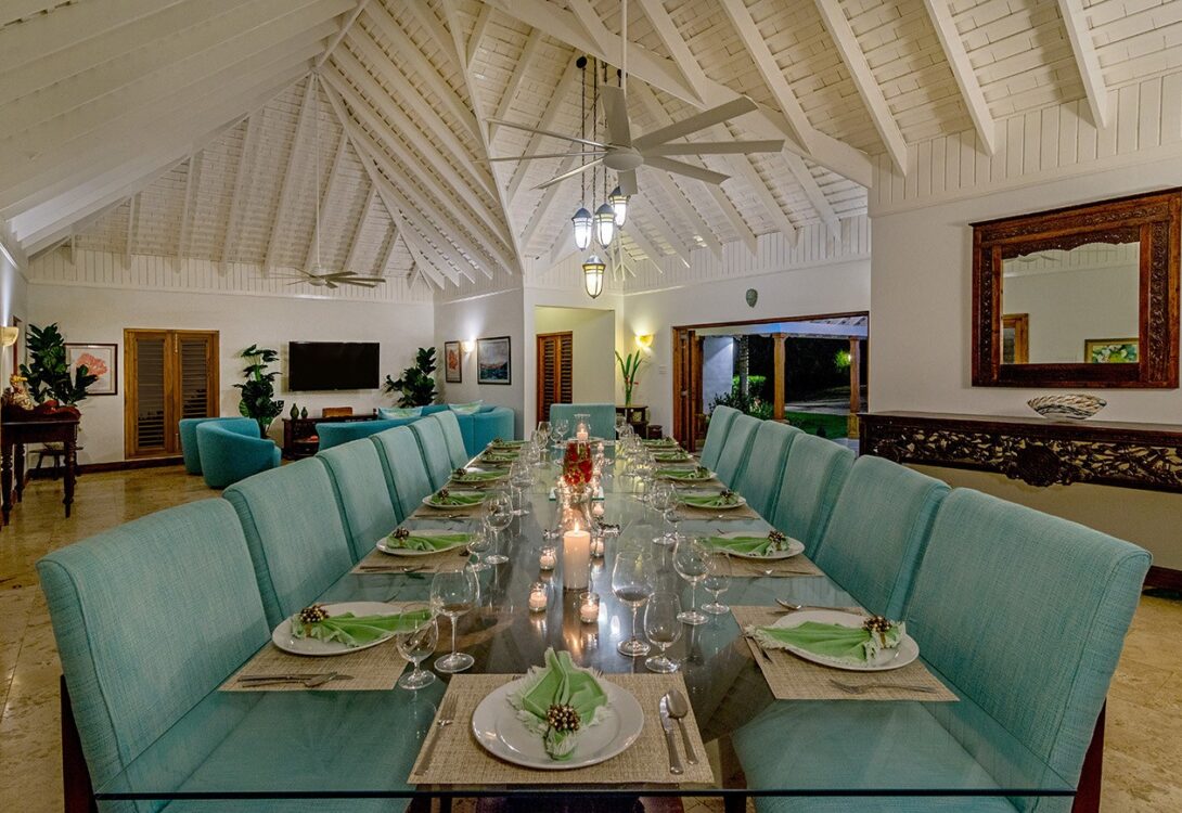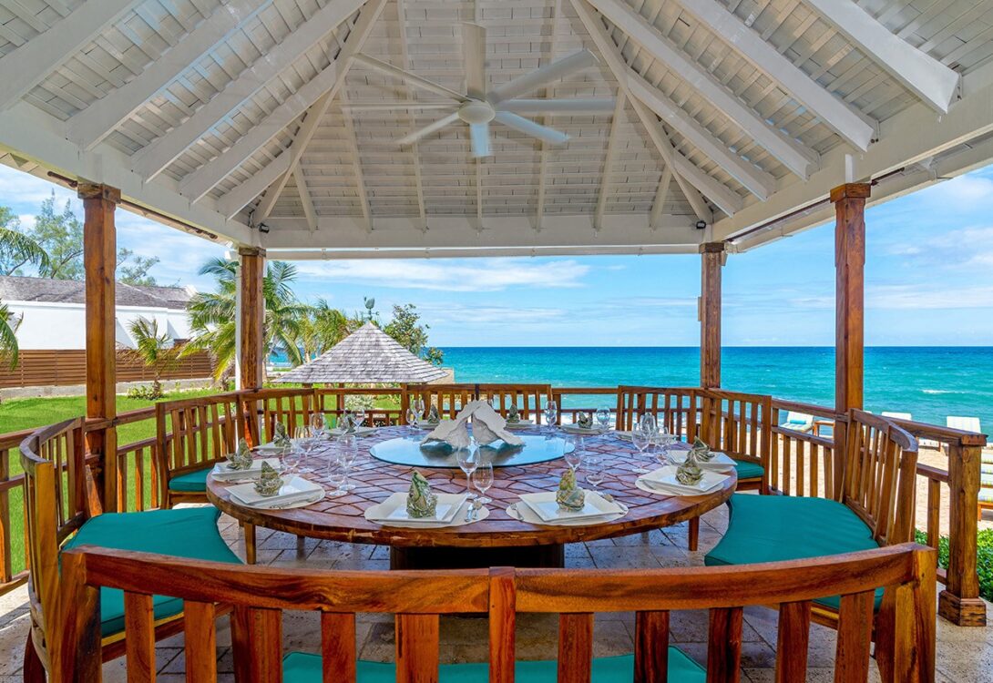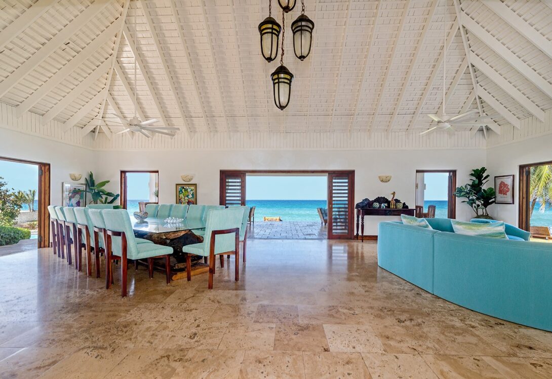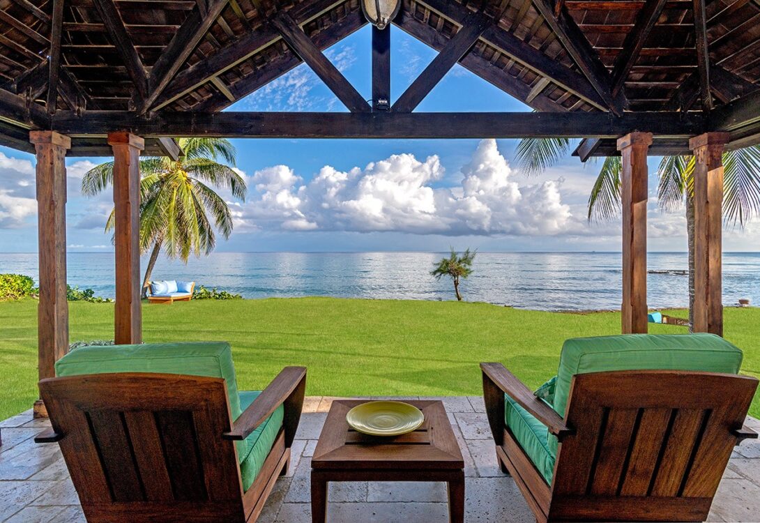 The large and luxuriously decorated sitting room and veranda beyond offer fabulous views of the sea and the extensive pool deck and sprawling lawns – including a barbeque lawn offer plenty of space for relaxing. For dining, guests have the choice of the oceanfront gazebo or a formal dining room inside.