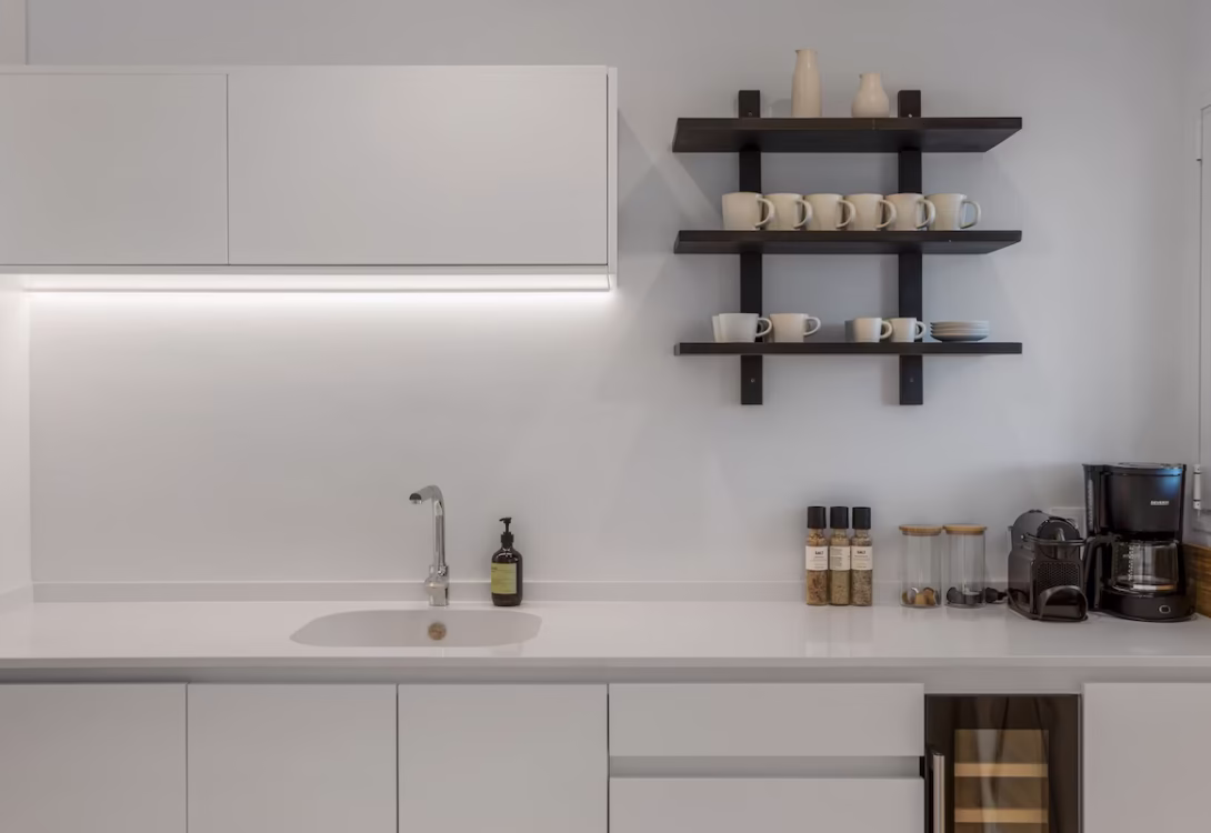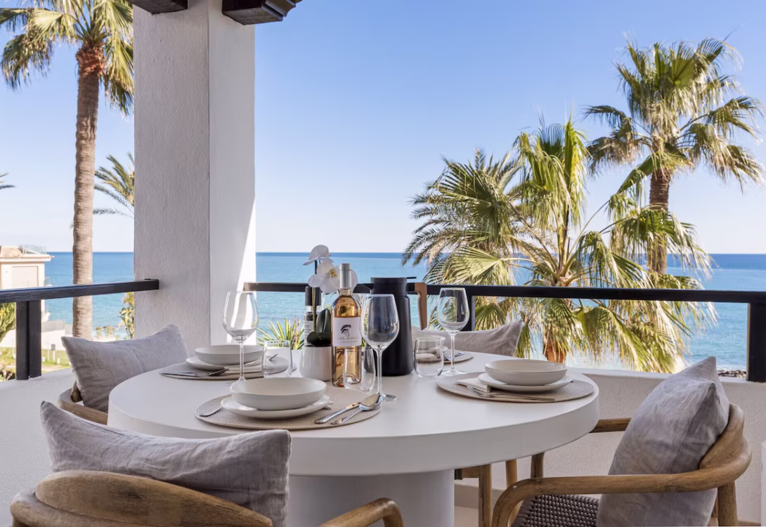 The apartment features two double bedrooms, both with stunning sea views. The master bedroom includes an en-suite bathroom and has direct access to the private terrace, where guests can wake up to the sight and sound of the waves. The second bedroom has a separate modern bathroom, ensuring comfort and privacy for all guests.
