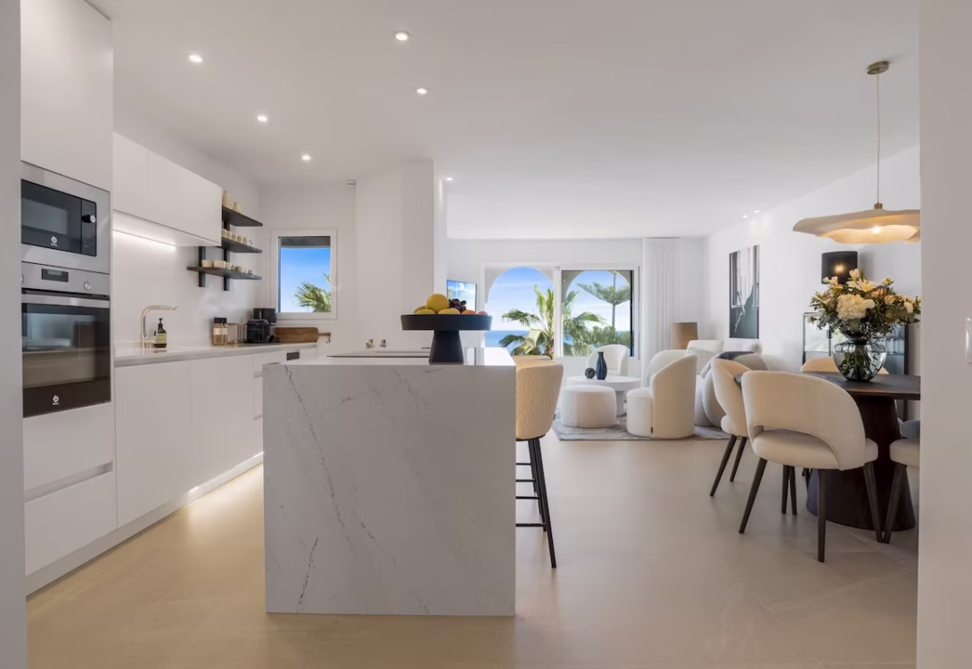 The open-plan living area is bathed in natural light, leading to a spacious terrace with its own dining area, perfect for enjoying meals with a breathtaking backdrop of the sea and the community pool below.