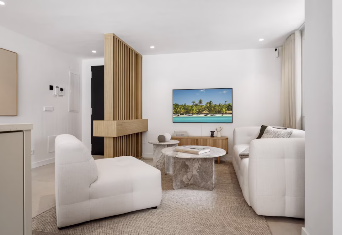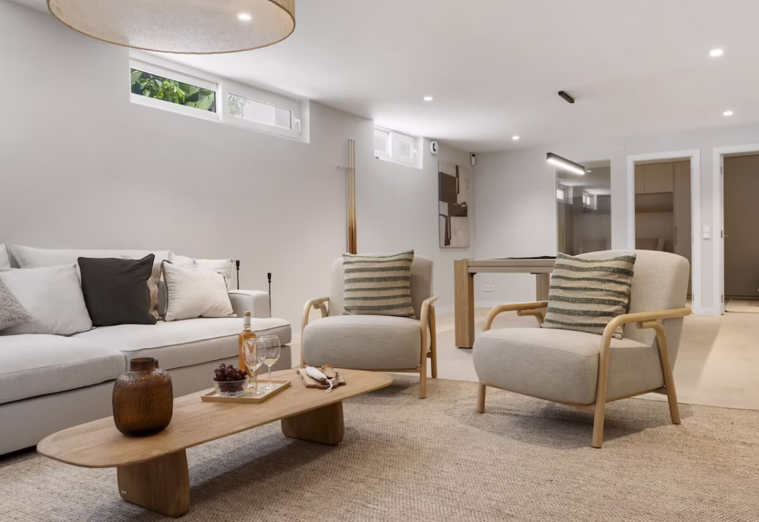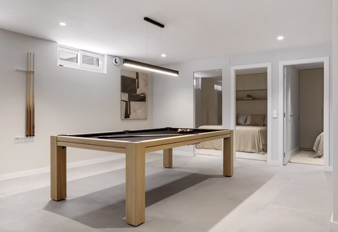 Inside, the villa boasts an open-plan layout with a fully equipped kitchen fitted with modern appliances, including two combination washer-dryer units, two dishwashers, and a wine cooler. The cozy living area is perfect for movie nights or downtime, and the fun continues with a pool table and a PlayStation 5, making it easy to entertain both kids and adults alike. High-speed Wi-Fi is available throughout the property. To elevate your stay even further, Villa Maria includes a private gym, a sauna, and a jacuzzi—offering the perfect balance of activity and relaxation.