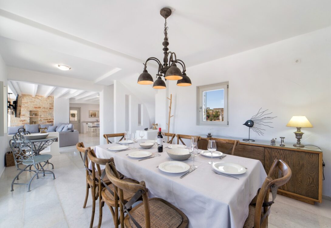 The ground floor of Villa Tzane features a stylish, fully equipped kitchen and a dining area that seats eight, ideal for both quiet family breakfasts and lively group dinners. The main living room is designed for relaxation, complete with a plush sofa and flooded with natural light.