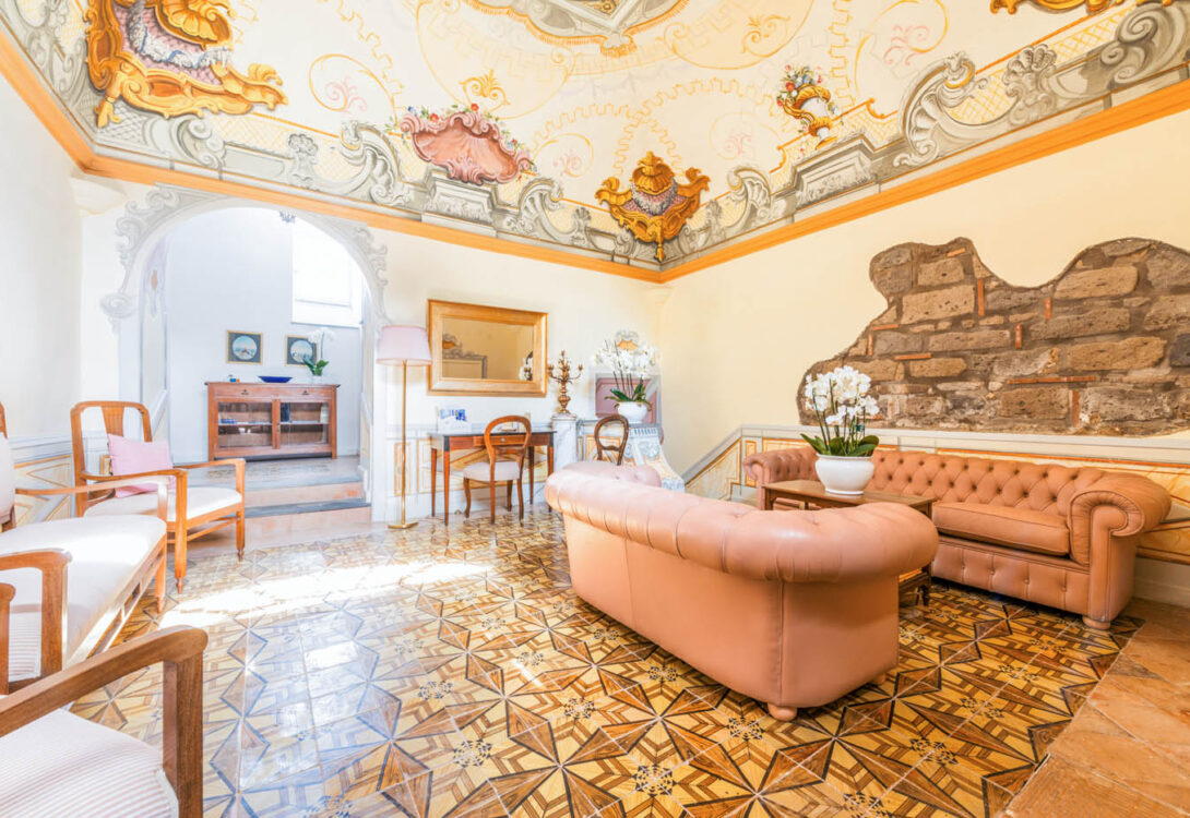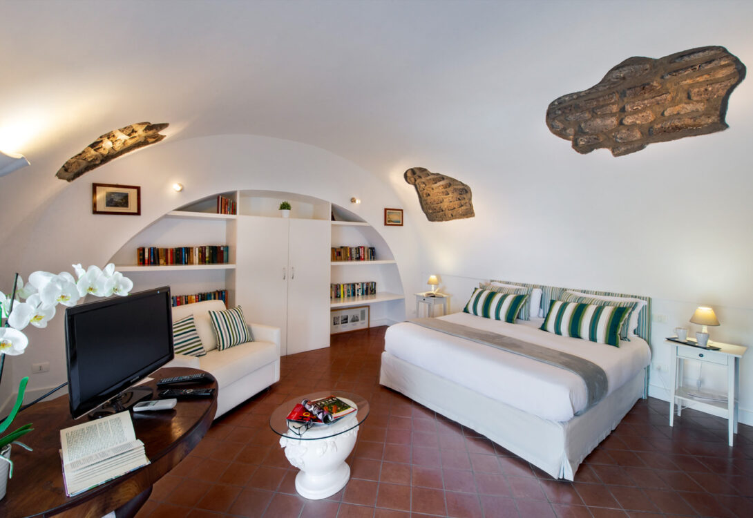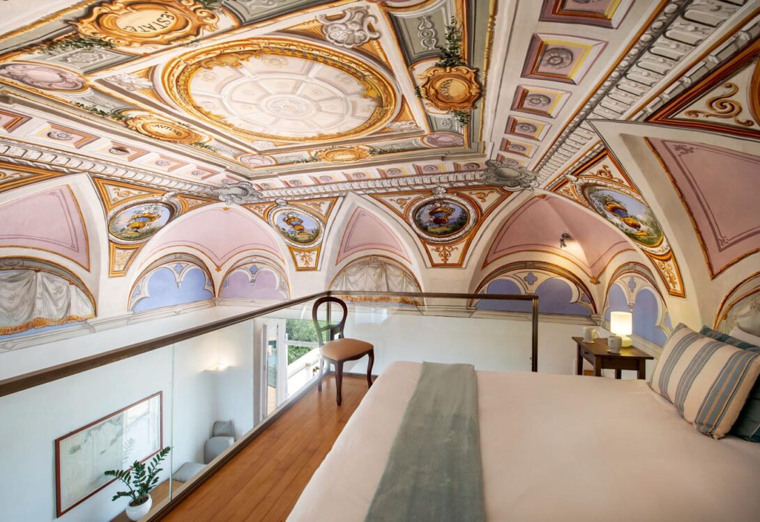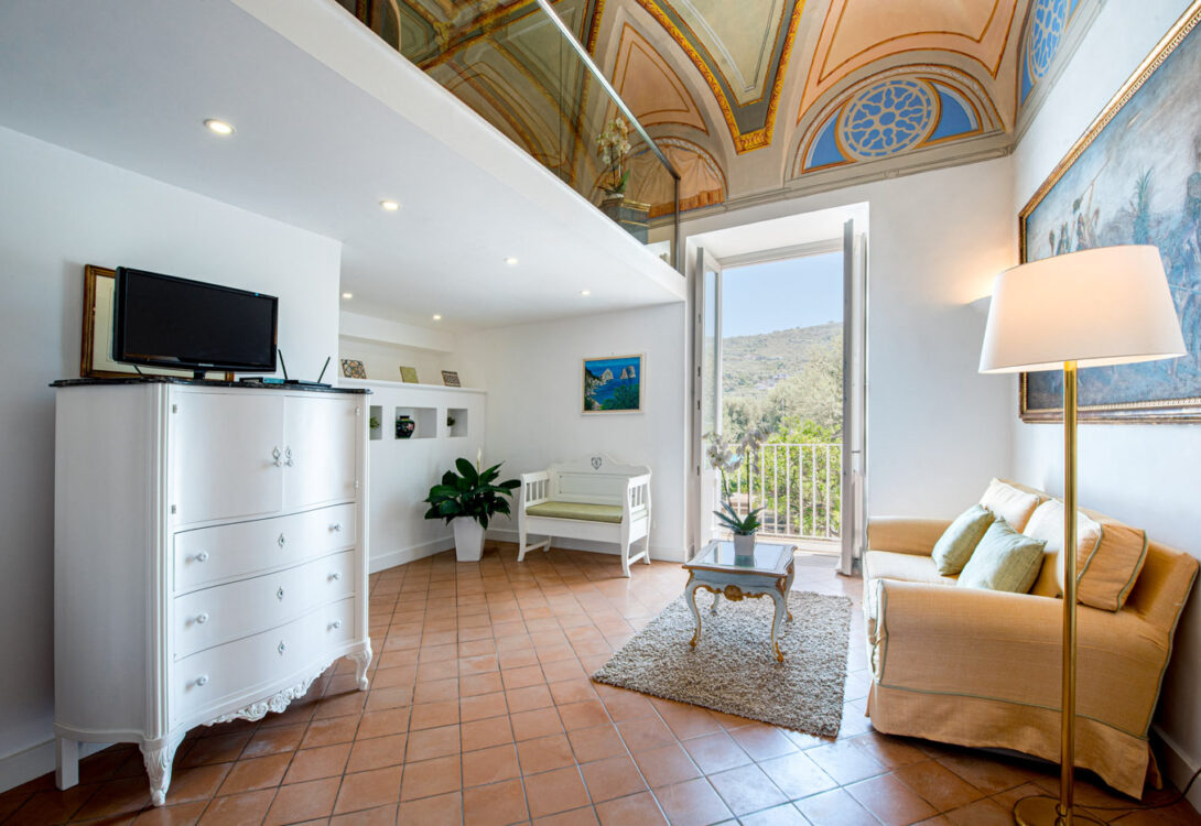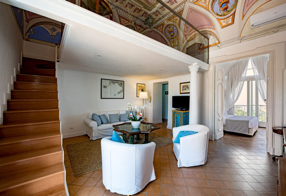 - Second Floor Family Suite #2: A mezzanine queen bedroom and a separate queen bedroom, sharing a spacious bathroom. The suite features a living room with high vaulted frescoed ceilings, oversized panoramic windows, and access to a furnished terrace.