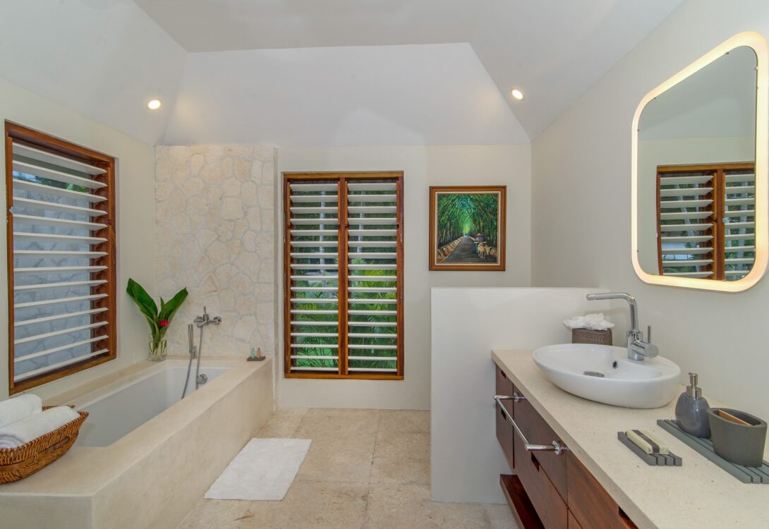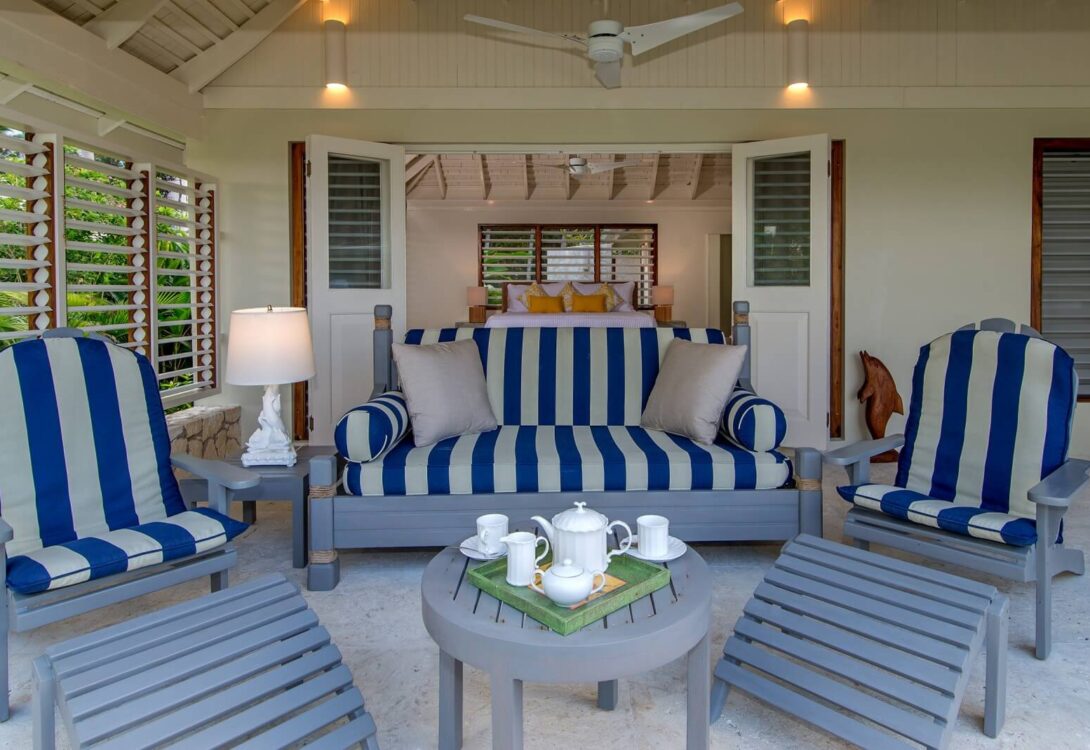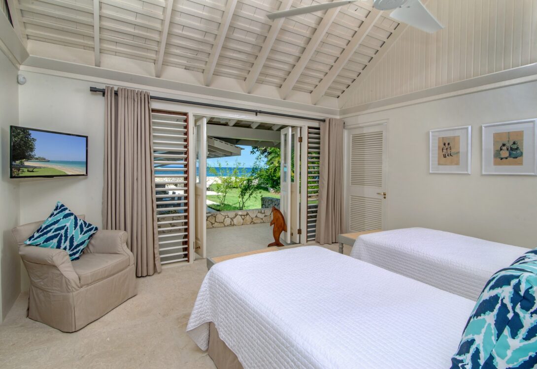 The bedrooms are all air conditioned with private en suite bathrooms. Four of the five bathrooms have attached outside showers. The large sea and pool facing master bedroom has a king bed. All other bedrooms are furnished with twin beds which may be combined as kings if required. A further two bedrooms are in an ocean facing cottage with views across the sea to Montego Bay.
