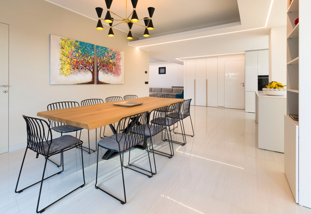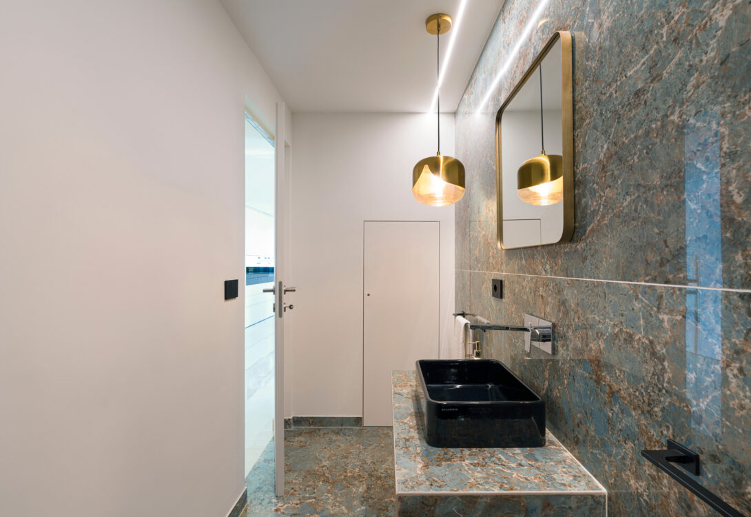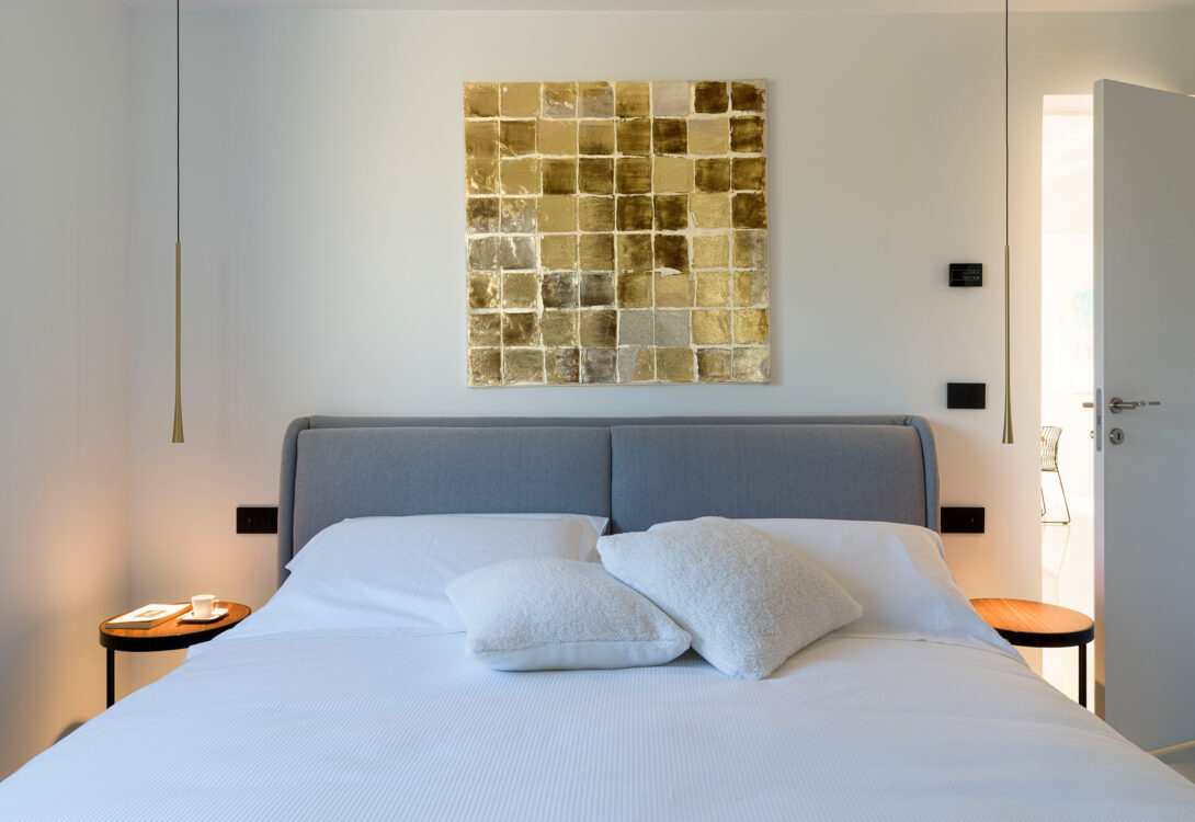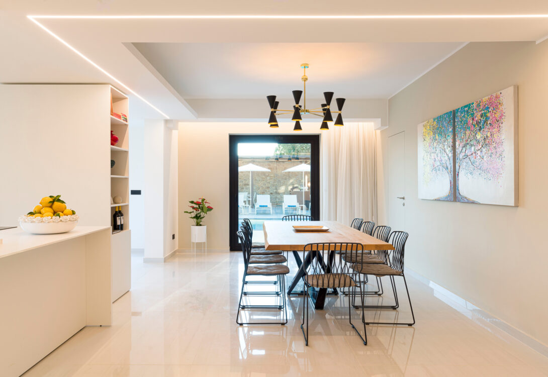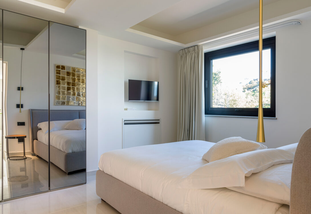 On the first floor, there is a second living room with terrace, a second kitchen, two bedrooms, one with private bathroom, a bedroom with two single beds and a bathroom with shower. Furnished with taste and attention to detail, the villa is equipped with all modern comforts: air conditioning in all rooms, Wi-Fi, washer-dryer, 2 dishwashers, 7 smart TVs, wine cellar and ice machine.