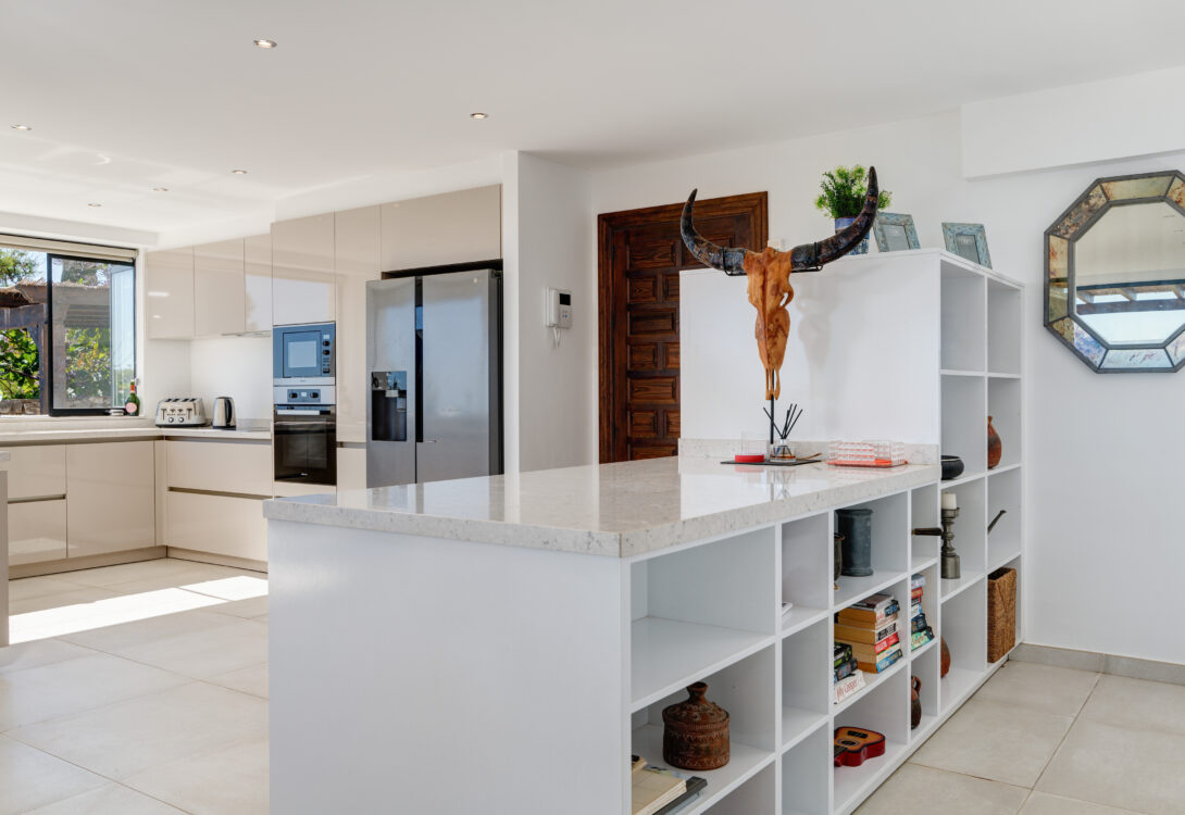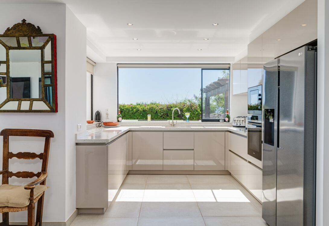 The open-plan lounge and kitchen area is designed for both comfort and style, featuring tasteful furnishings, comfortable seating, and panoramic views. The fully equipped kitchen boasts modern appliances, including integrated ovens, a refrigerator, a freezer, and an electric hob—making it easy to prepare meals while still enjoying the villa’s breathtaking surroundings.