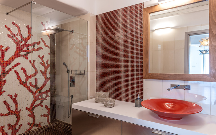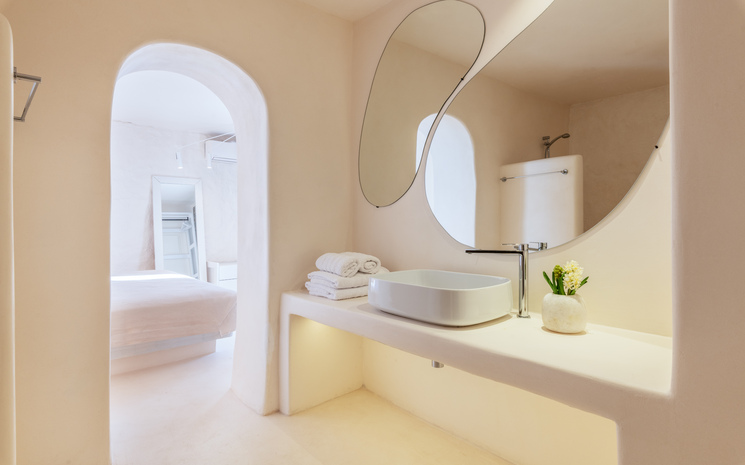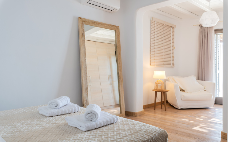 All eight bedrooms are light and airy and are complemented by sophisticated en suite bathrooms and tasteful art deco elements. Located on the ground floor is the first master bedroom with a king sized bed as well as an additional double bedroom. Heading down to the pool level, guests will find the second master bedroom, two double bedrooms and a suite all with access to the main pool area as well as a guest room with private entrance. The final suite is located on the lower level and has access to the outdoor area.
