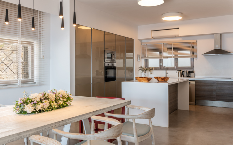 Split over three levels, the villa showcases a modern design characterized by its minimalist interiors decorated in soothing pastel colours. The ground level features an open plan layout with a fully equipped kitchen, a dining table, and inviting lounge corners decorated in neutral tones.