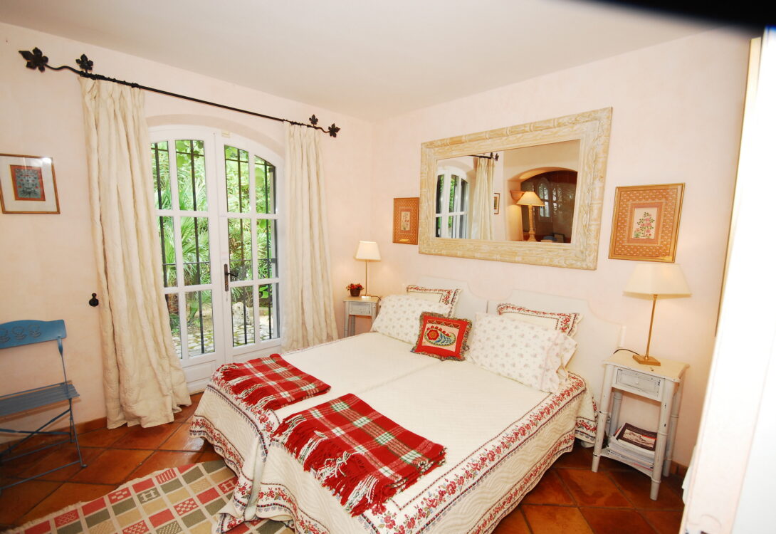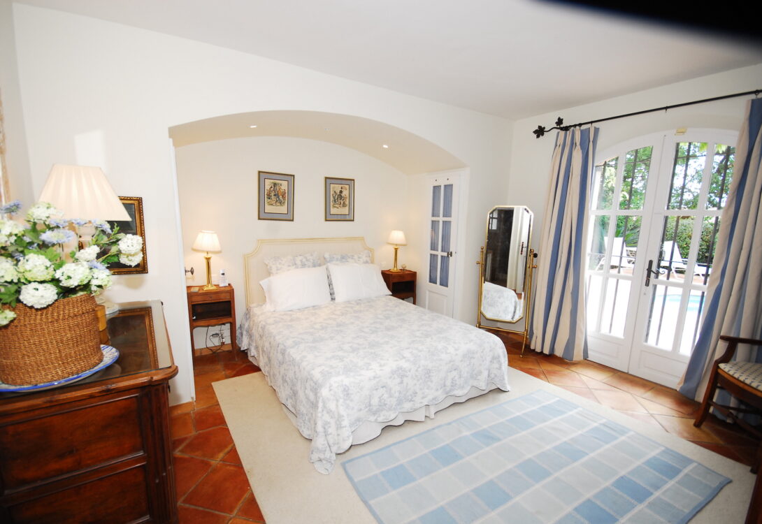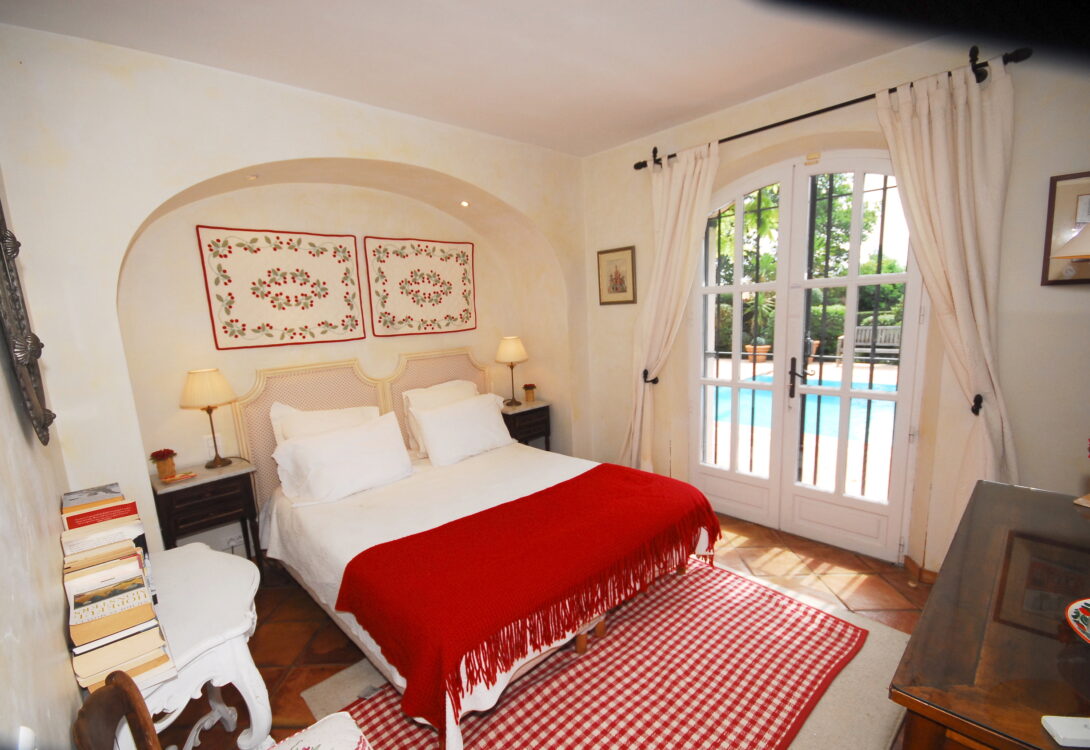 1/ Master bedroom 160 cm bed with en-suite bathroom, WC, French doors to terrace and pool
