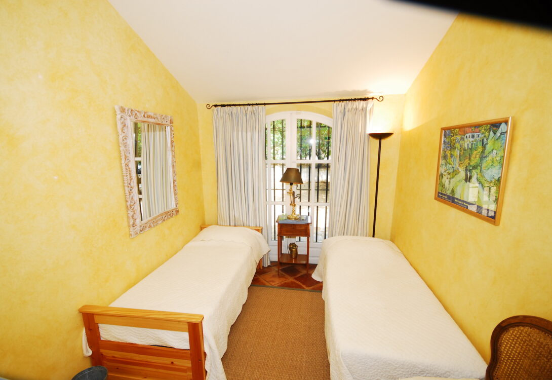 3/ Twin or Double bedroom 160 cm bed or twin beds 80 cm beds with en-suite bathroom, WC, French doors to rear garden