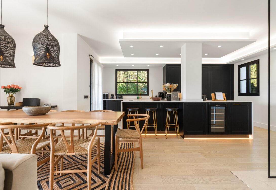 Main Living Area (First Floor): At the heart of the villa, the first-floor kitchen-diner exudes style and functionality. The kitchen features sleek black cabinetry, a gleaming white worktop, and top-of-the-line appliances, including a wine fridge. The adjoining living room offers an inviting space with a large fireplace and access to an expansive terrace, perfect for entertaining or enjoying quiet evenings.